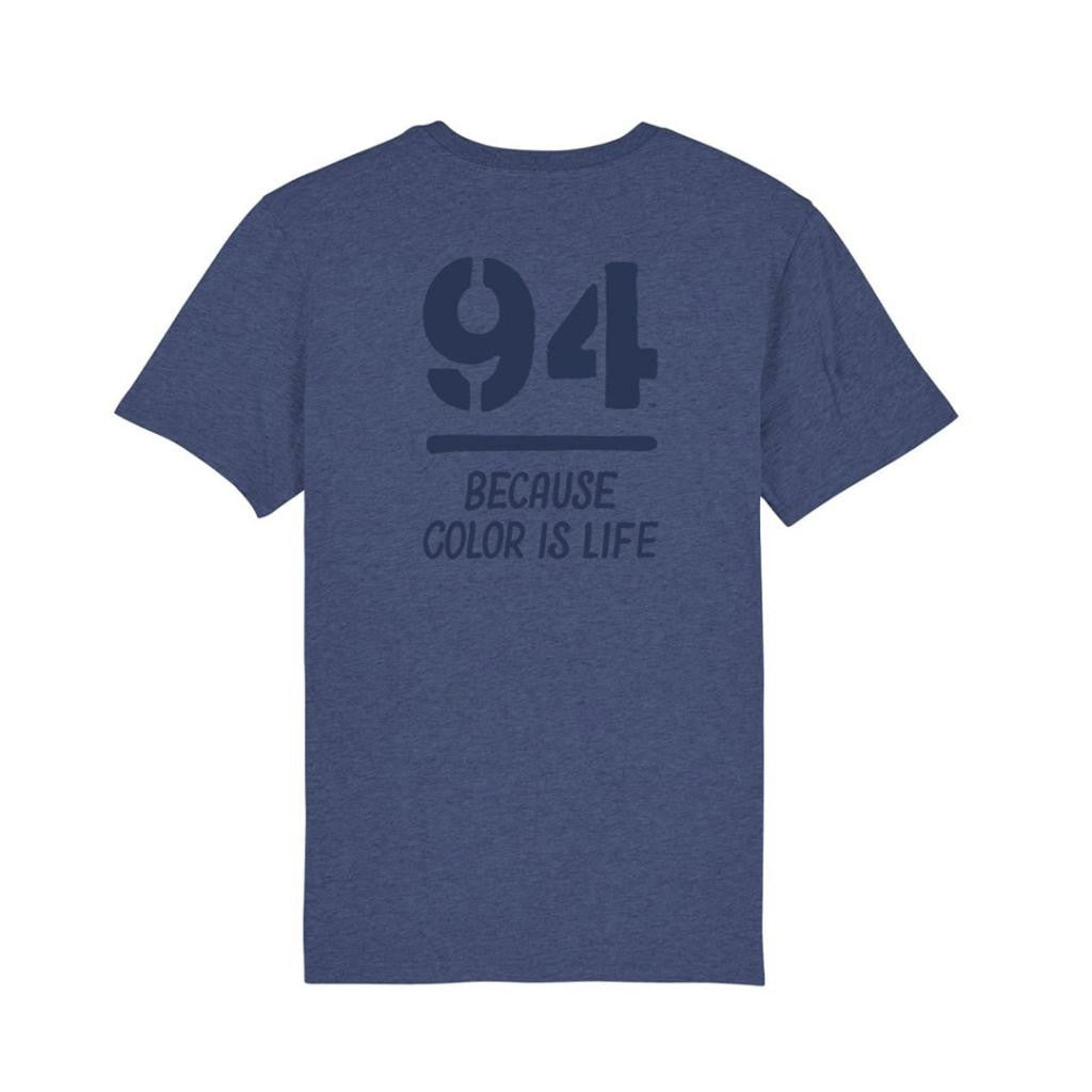 A unisex, ecological T-shirt, inspired by the design of the MTN 94 spray cans. It features two prints of the 94 logo: one on the left chest and a larger one on the back, along with the phrase "Because Color Is Life".