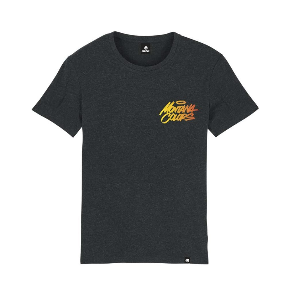 An ecological unisex T-shirt that incorporates two calligraphic “Montana Colors” stamps: one on the left chest and a larger one on the back.