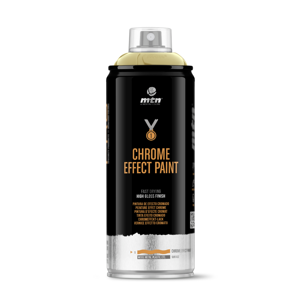 MTN PRO Metal Effects Spray Paint - Gold is a very fast drying metallic paint formulated with extremely high quality resins and metallic, inorganic pigments. Designed to give a metallic chrome finish to any type of surface. Its perfect finish offers a great aesthetic effect and is indicated for plastic, artistic and decorative work.