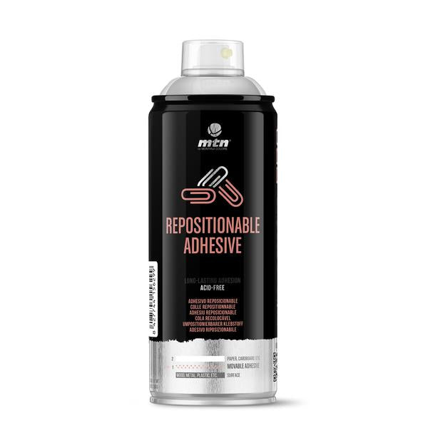 MTN PRO Repositionable Adhesive is a special spray adhesive for layout and composition work that allows for multiple adjustments before the final gluing. It provides instant, safe and repositionable bonds that do not weaken over time.